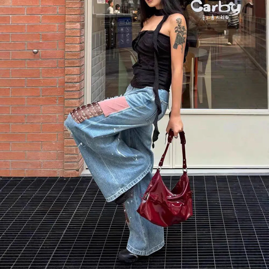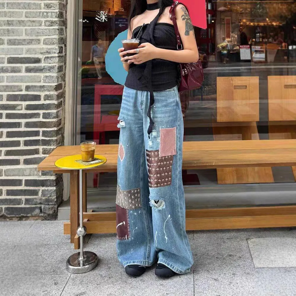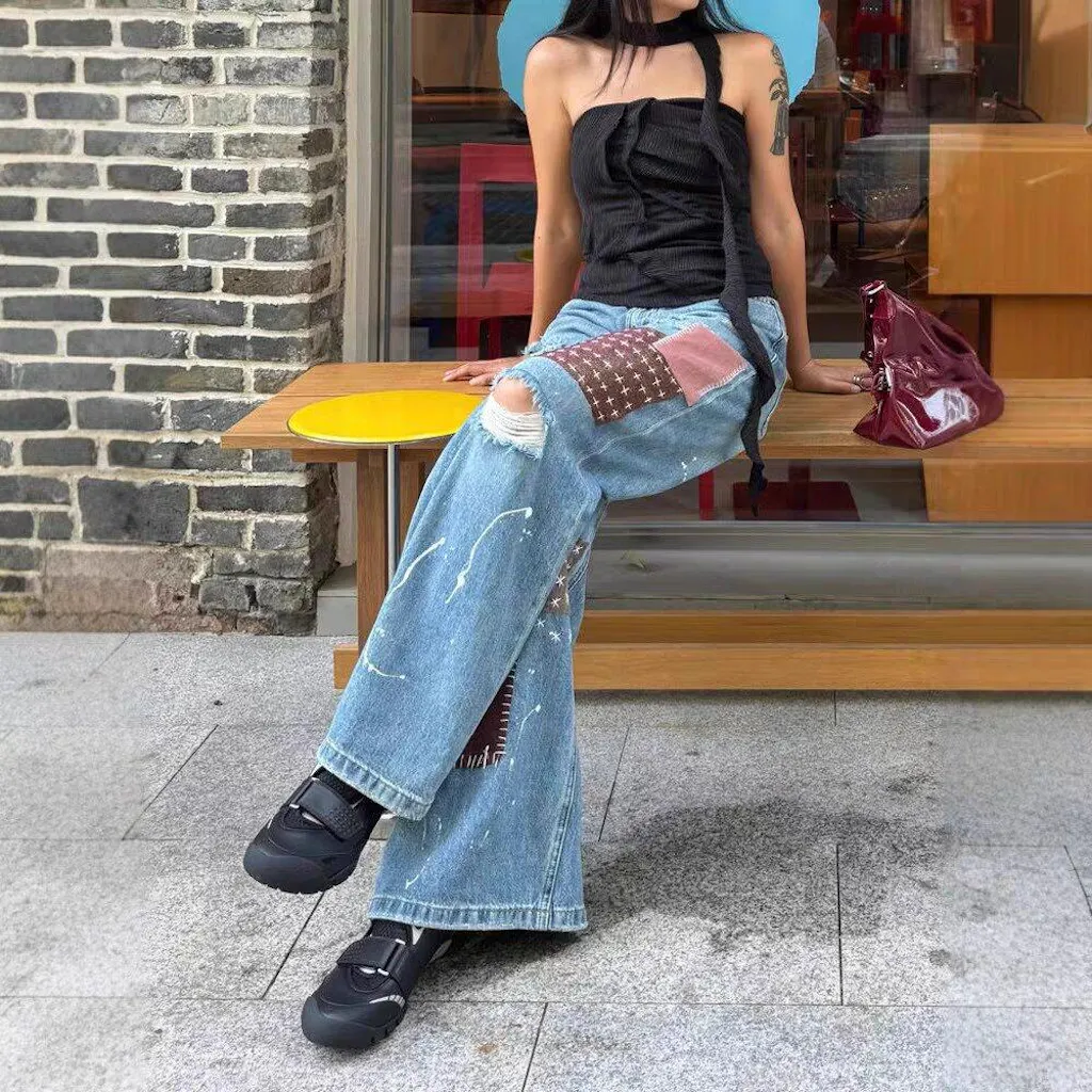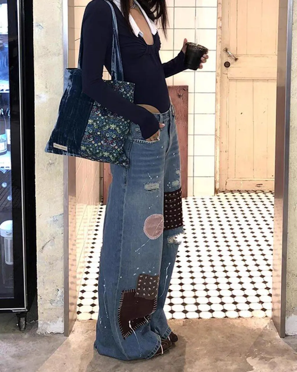 Diseñados con una cintura de tiro bajo a medio, pierna ancha de largo completo, rotos desgastados, detalles de salpicaduras de pintura y paneles de patchwork en tonos tierra, este par aporta detalles principalmente a través de la superficie y la construcción estilo reparación. Las proporciones se mantienen holgadas y relajadas, lo que los hace más atractivos con una camiseta lisa o un suéter más limpio en la parte superior.