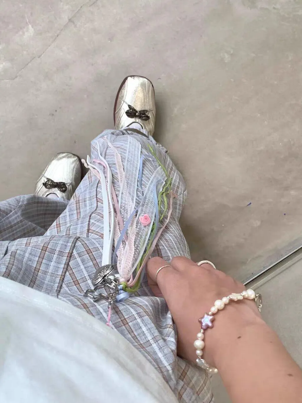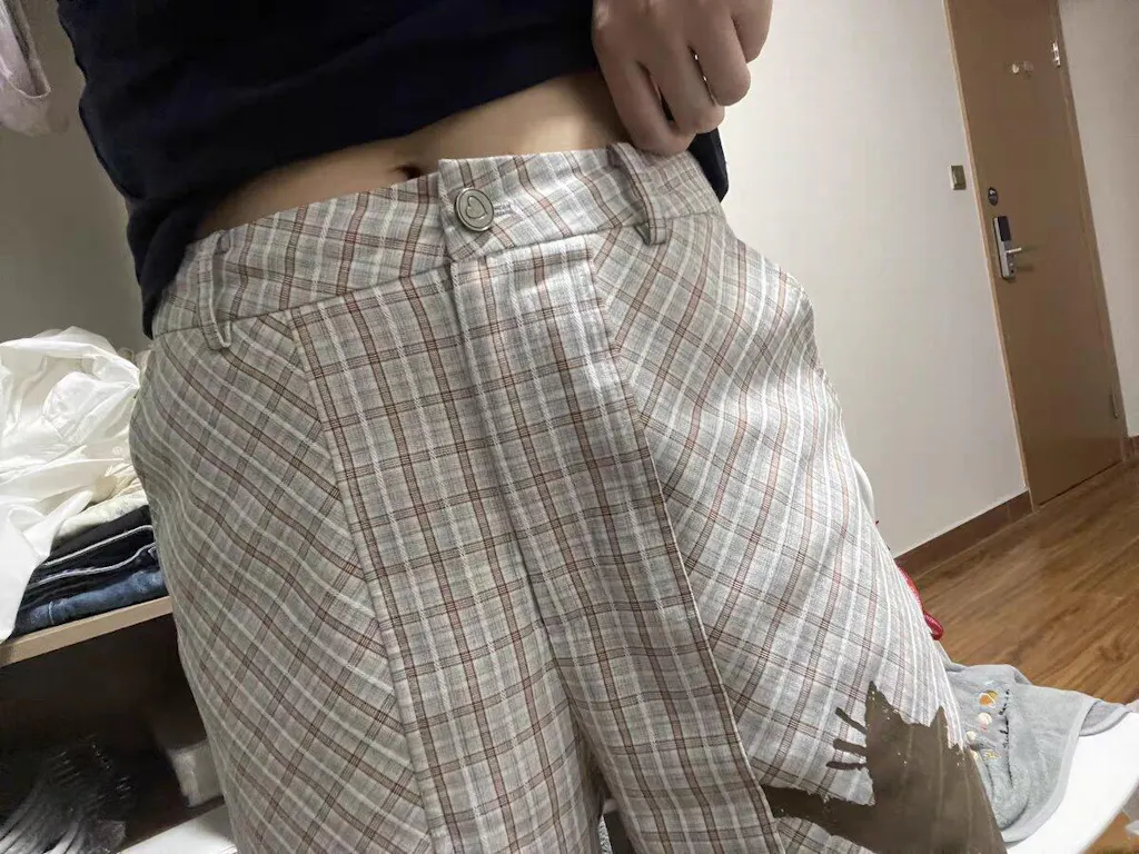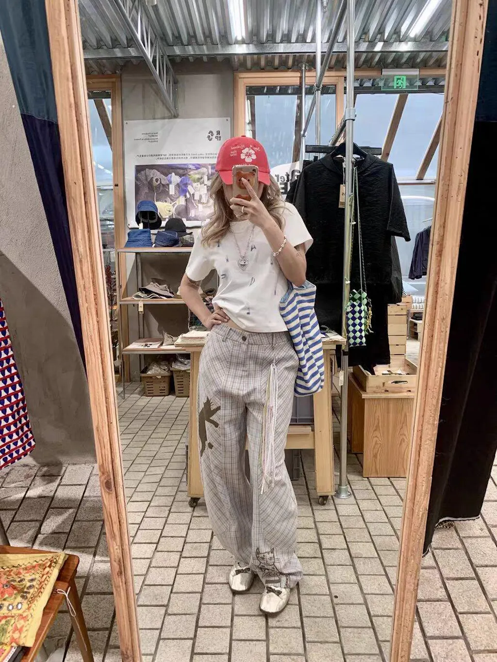 Diseñados con una cintura baja, un discreto fondo a cuadros, gráficos de bocetos de gatos colocados a lo largo de la pierna y el dobladillo, y una silueta larga y ancha que se amontona ligeramente sobre el zapato, este par se encuentra entre lo novedoso y lo pulcro. Funciona mejor con tops más sencillos que permitan que la ubicación del estampado sea visible.