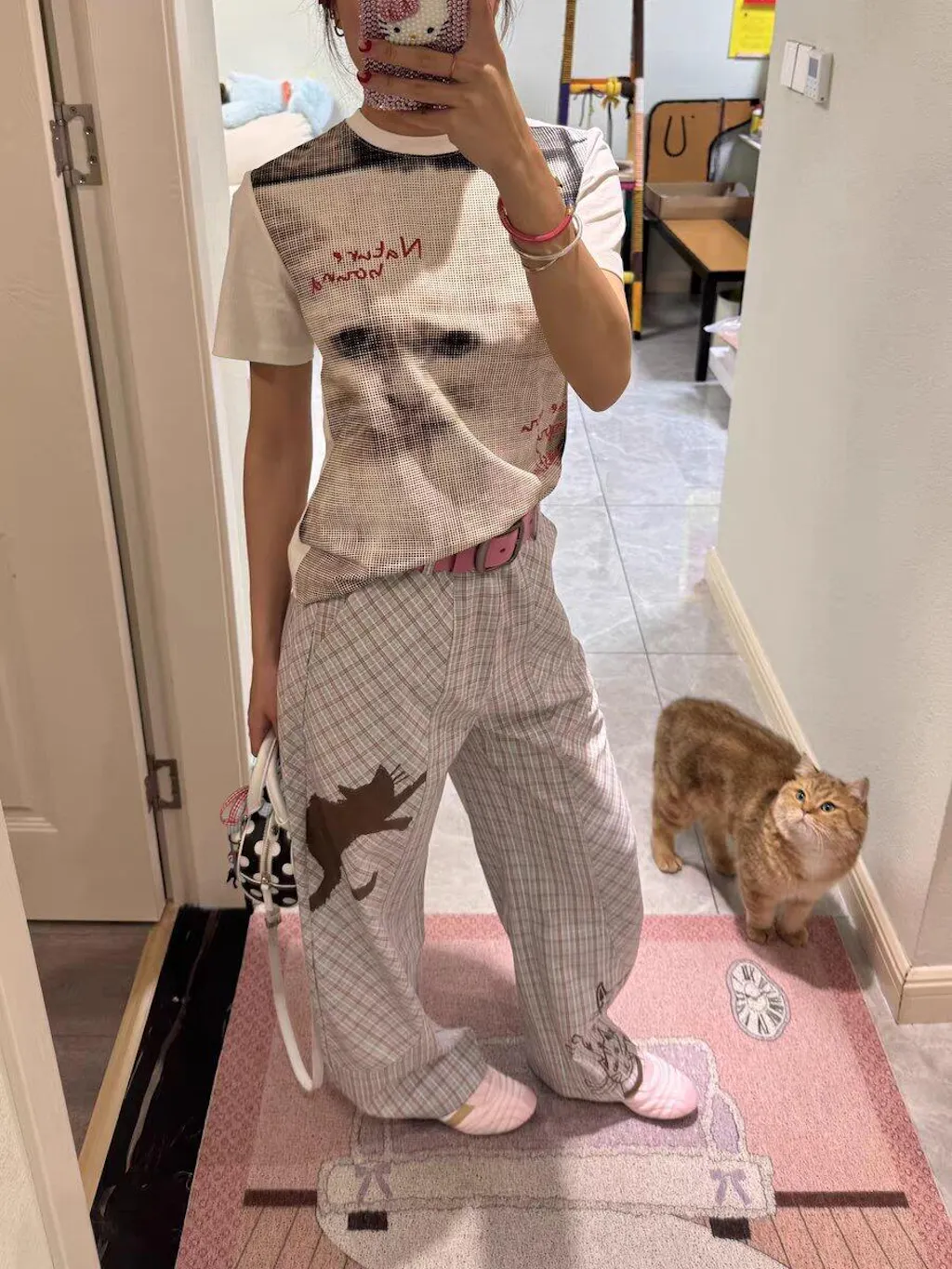 Este par se siente divertido sin perder la forma. La suave base a cuadros mantiene los pantalones discretos, mientras que los gráficos de bocetos de gatos rompen la pierna con la personalidad suficiente para que el look sea memorable.