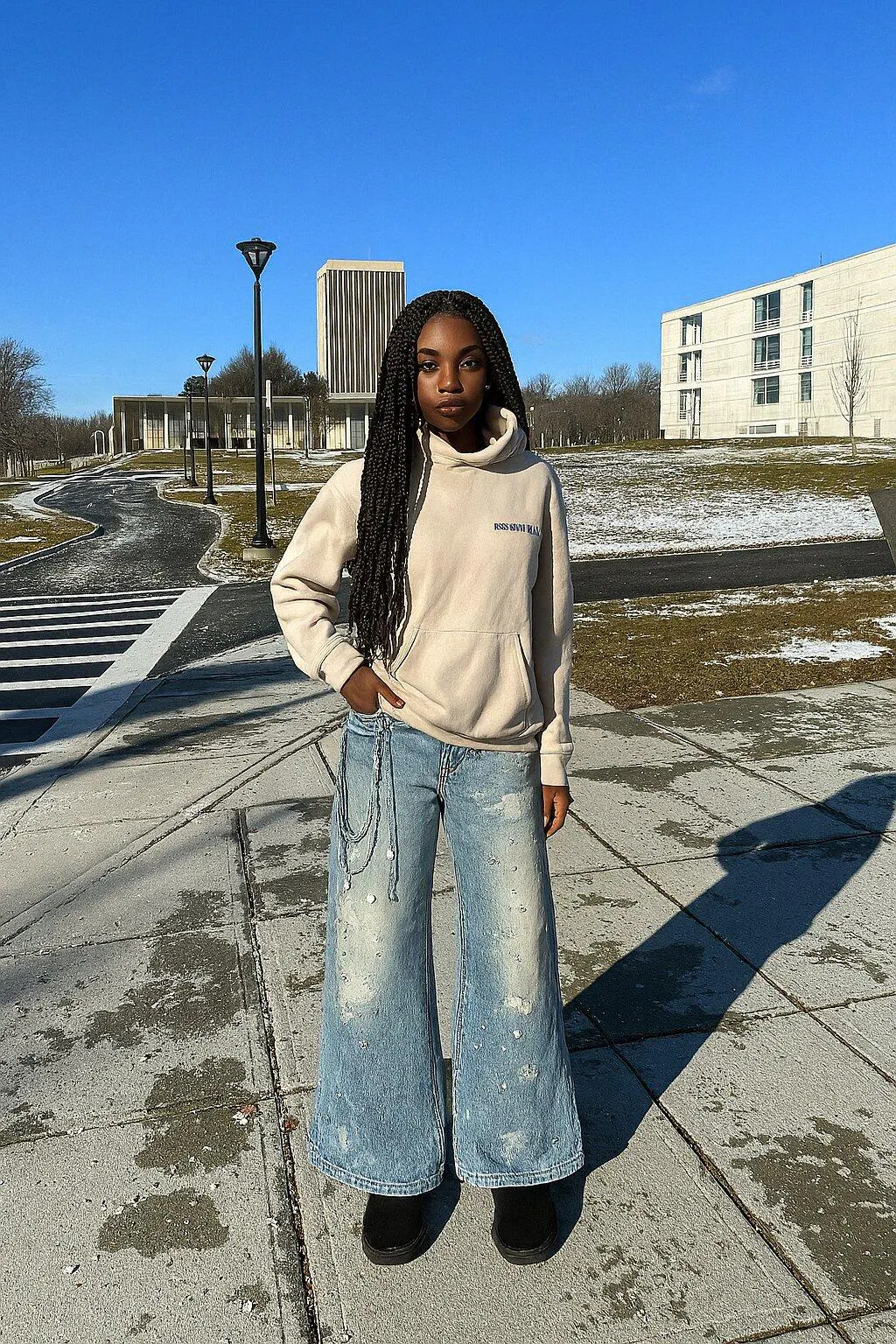 Este par convierte el denim desgastado en una pieza de declaración con estilo. La base azul lavada, los herrajes de cadena y los detalles de pedrería dispersos hacen que los jeans se sientan direccionales sin perder la facilidad de un ajuste de pierna ancha.