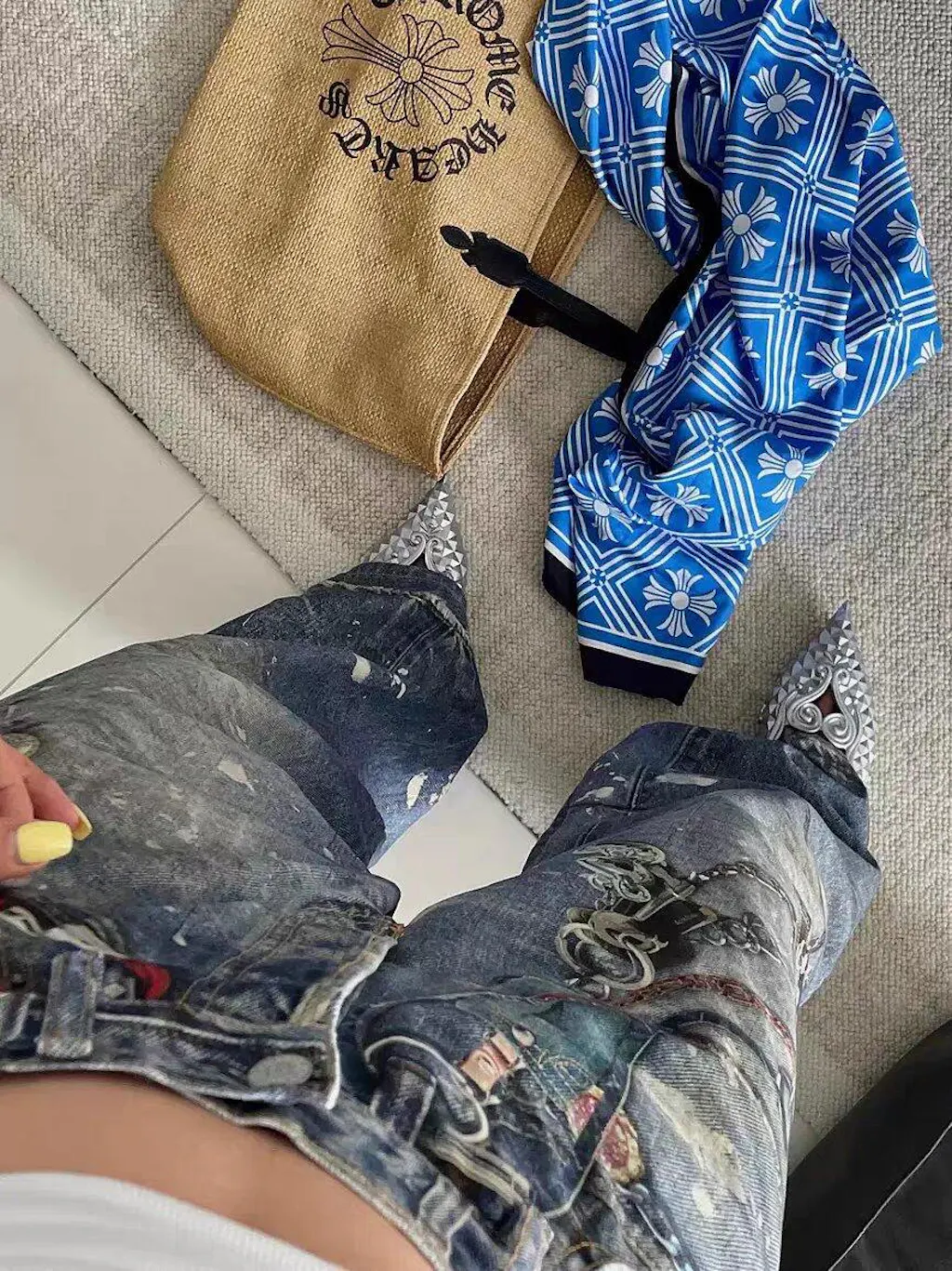Diseñado con una cintura holgada, corte de pierna ancha, fuerte variación de lavado, desgastes y detalles de metal y dijes adjuntos, este par tiene un acabado más rudo sin perder la forma. La vista trasera se mantiene más limpia que la delantera, lo que ayuda a que el denim se sienta más estilizado que sobrecargado.