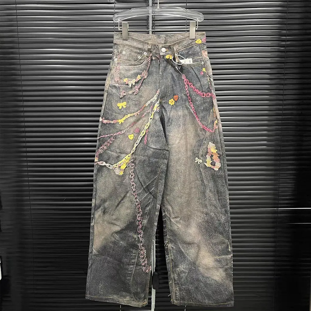 These jeans are playful, but the darker wash keeps the print from reading too sweet. The pastel chain graphics sit over a worn surface that gives the pair more depth and makes the silhouette feel easier to wear.