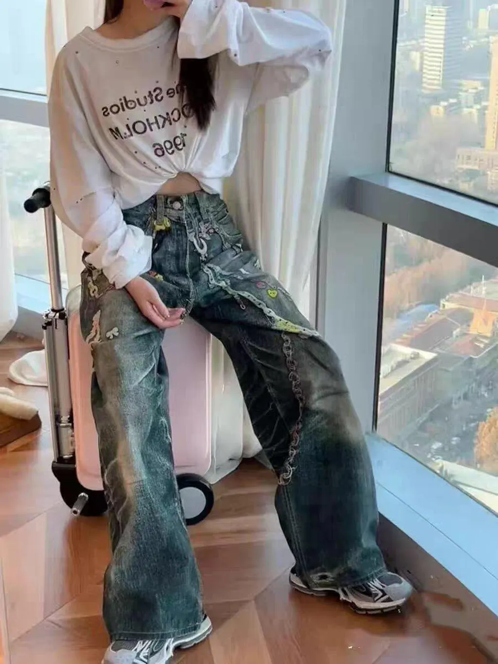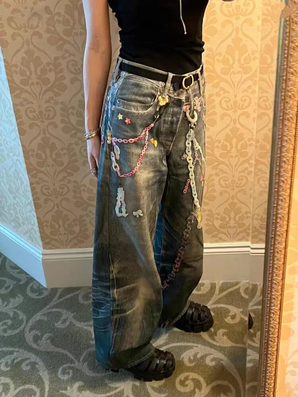 Designed with a lower rise, baggy straight leg, washed denim base, and allover chain and charm-style print, this pair creates a strong visual effect without relying on heavy hardware. The line stays loose and longer through the hem, so the print still feels balanced against a cleaner top.